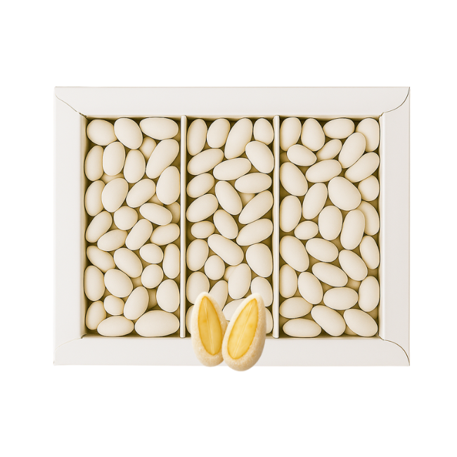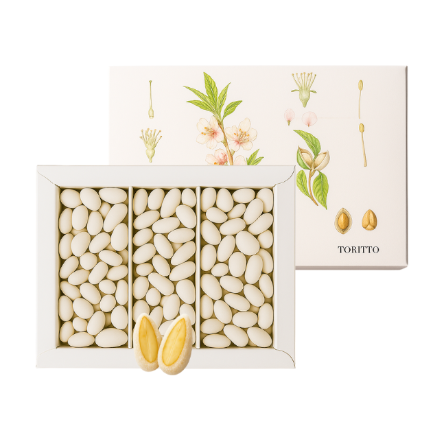 Un confetto essenziale e raffinato, realizzato con mandorla sgusciata e tostata Filippo Cea – una varietà autoctona pugliese di altissima qualità – avvolta in un sottile strato di zucchero di canna biologico e profumata con aroma naturale di vaniglia.