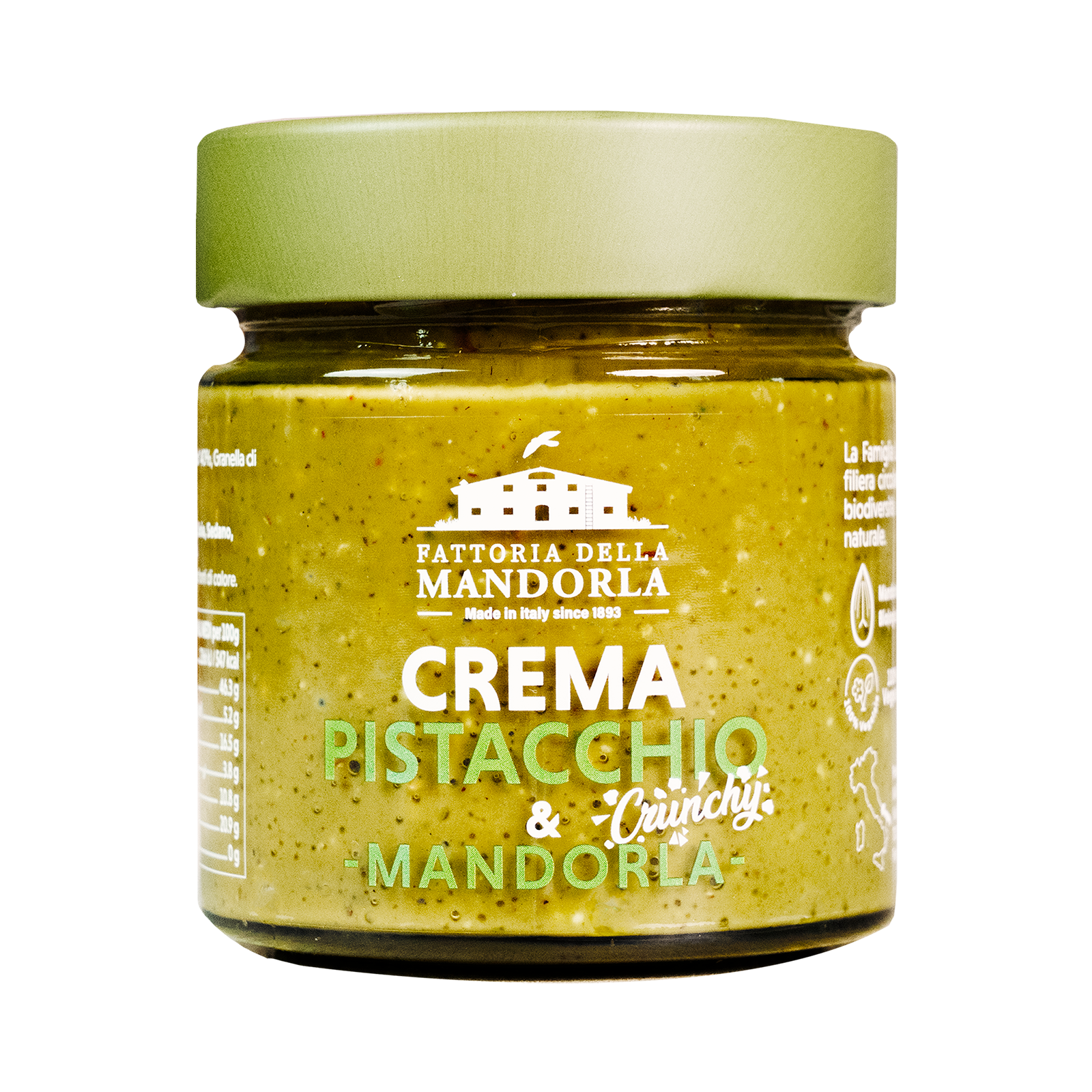 Una combinazione perfetta tra mandorle biologiche italiane della nostra filiera e pistacchi selezionati, arricchita da granella croccante di frutta secca tostata che esalta ogni cucchiaio con una nota rustica e golosa.